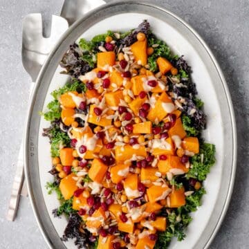 • Roasted Butternut Squash and Kale Salad with Roasted Garlic Tahini Dressing